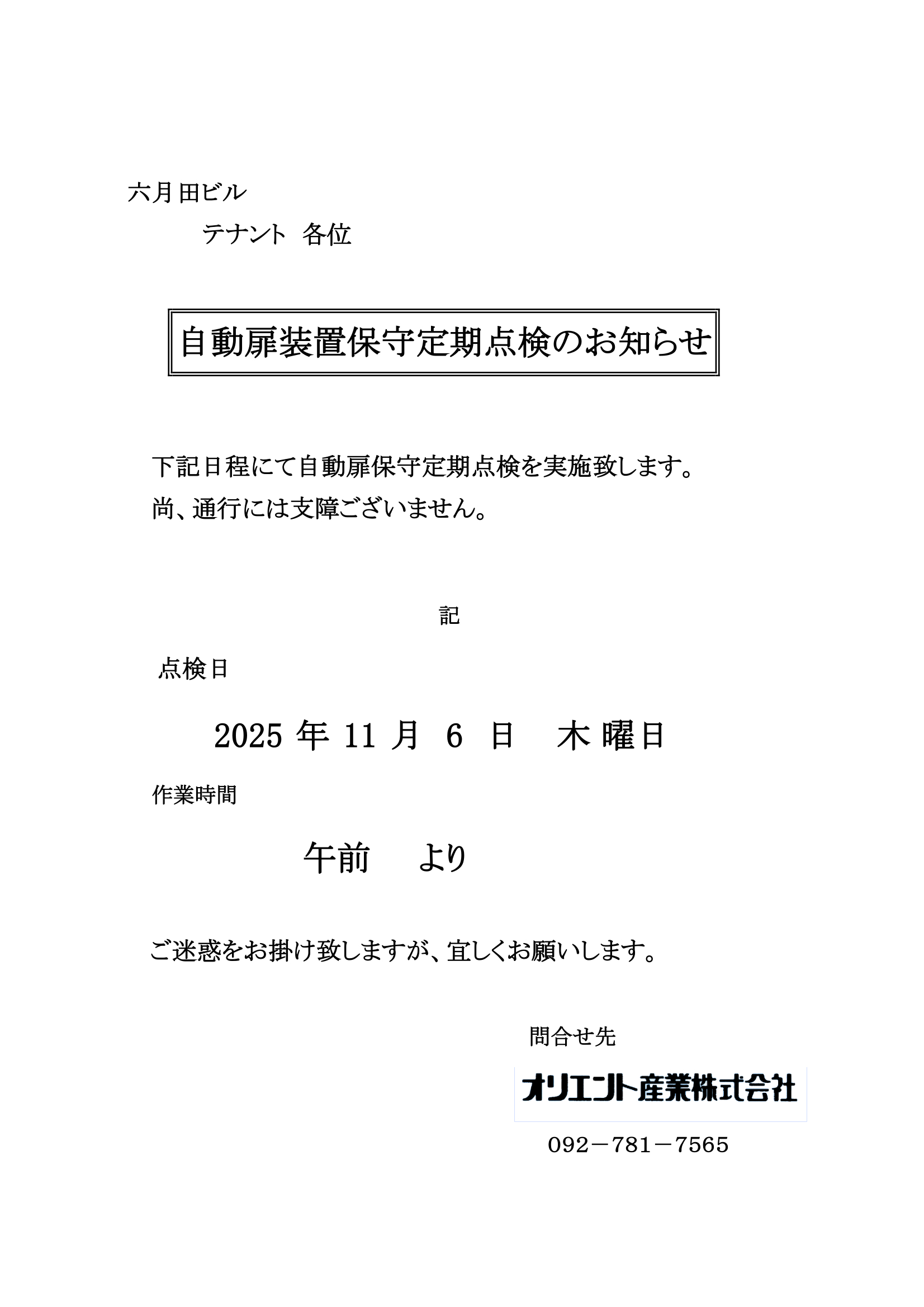 2. 【六月田ビル】11月6日 自動扉装置保守定期点検のお知らせ