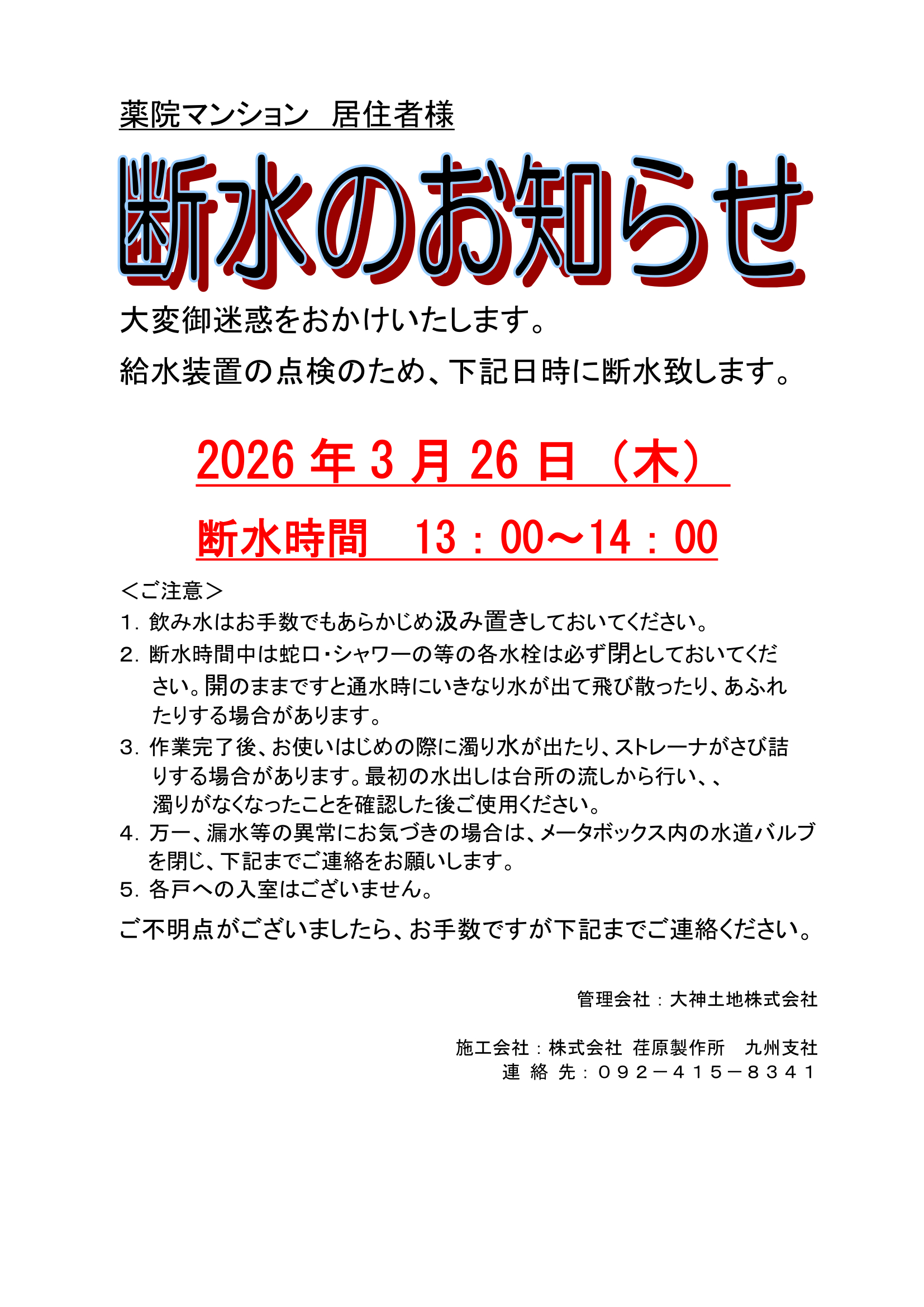 3. 【薬院マンション】3月26日 断水のお知らせ