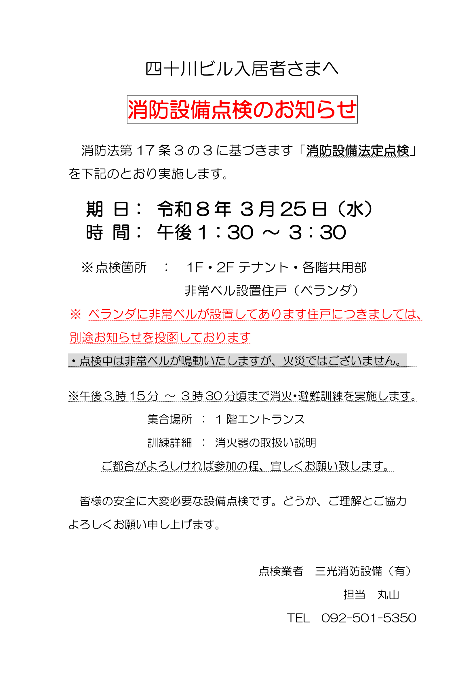 【四十川ビル】3月25日 消防設備点検のお知らせ